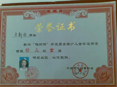 8月20--23日全國“雅韻杯”古箏大賽在南京舉行,昆山代表隊共有15名學(xué)員組成,參加5個(gè)級別的比賽,其中方新雨小朋友獲幼兒甲組金獎,邱舒怡小朋友獲兒童甲組金獎,朱靜蕓小朋友獲兒 童乙組金獎,再此向她們表示衷心的祝賀!